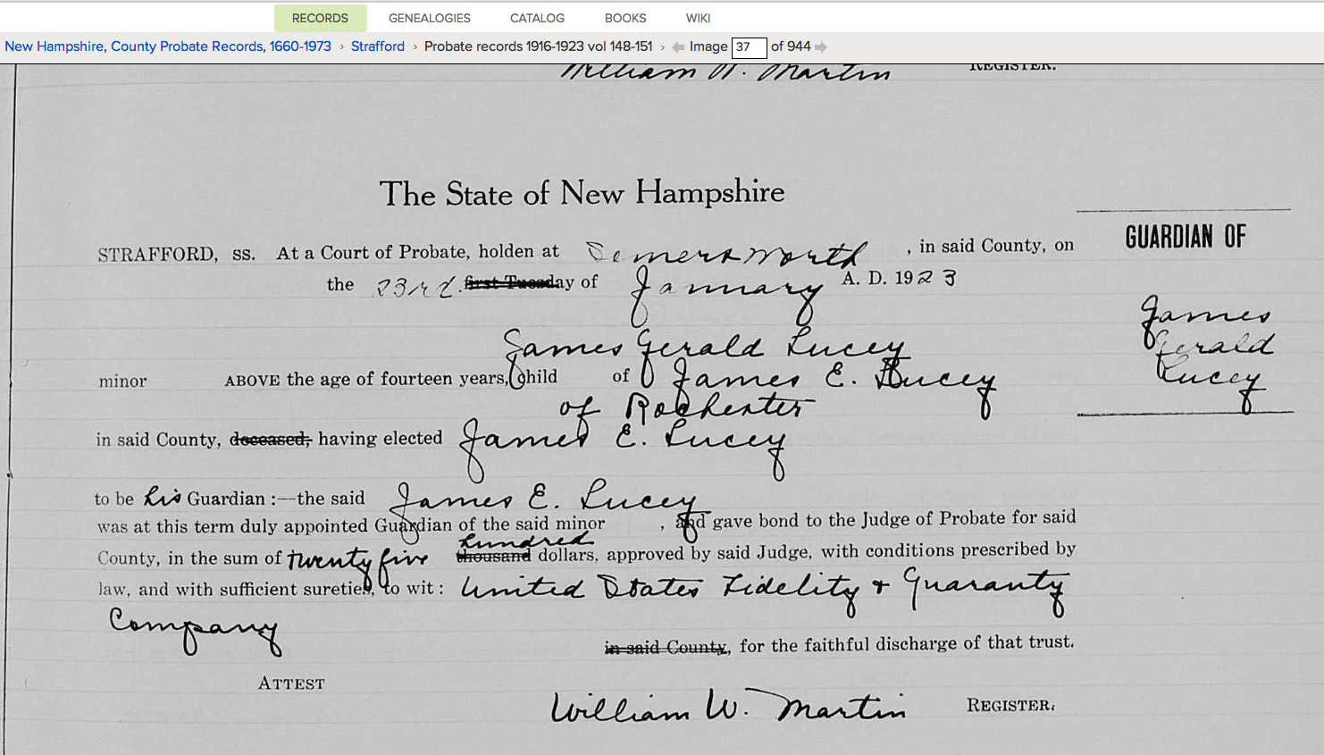 I found a guardianship record for him dated 23 January 1923 on familysearch.org, which is confusing, since his parents were both alive and it seems that his father is being named his guardian. Seems redundant to name a parent as your legal guardian. I recently learned that when a minor is left an inheritance that a guardian has to be established. Since Gerald was only 14, perhaps that’s the situation here. [thank you Heidi Forrester for asking the question on the Transitional Genealogists Rootsweb forum]. His grandmother Johanna (Donohue) Lucey died in March of 1922, perhaps she left Gerald an inheritance? I haven’t found any probate records for Johanna, but I’ll keep looking.