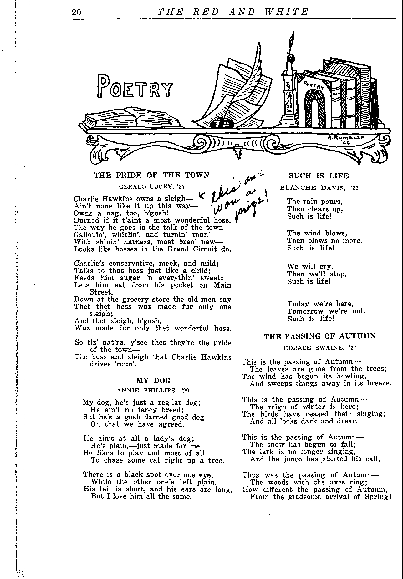 Poems from students Gerald Lucey, Blanche Davis, Horace Swaine, Annie Phillips, Kenneth Palmer, and Emerson Corson appeared in the Rochester High School yearbook.