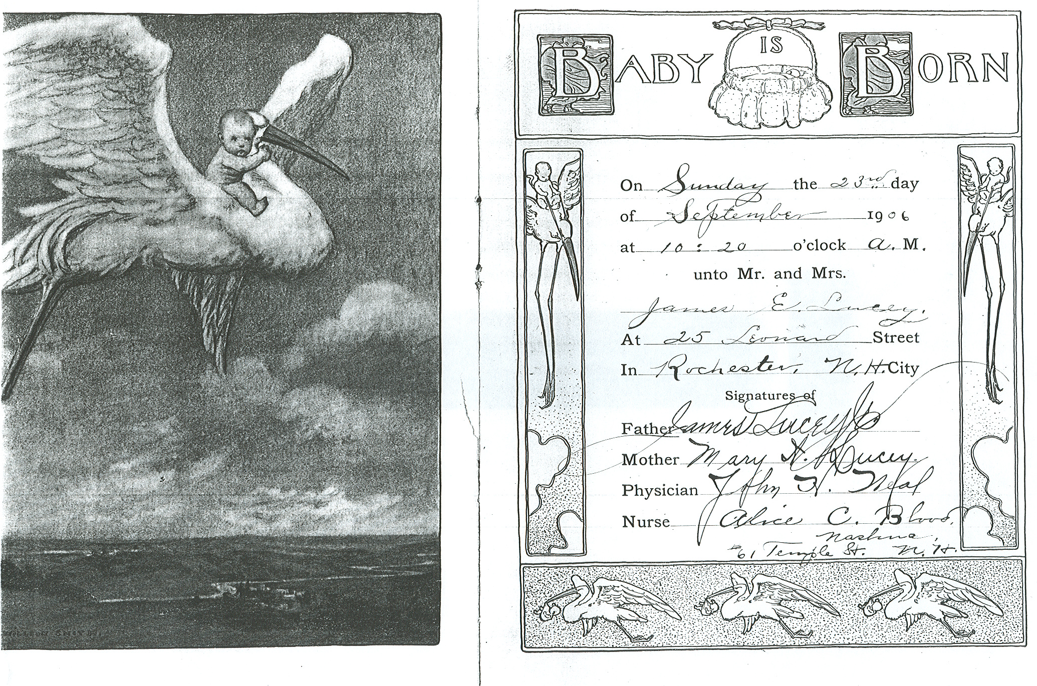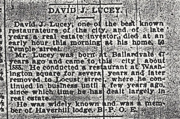 The floral tributes were as follows: Pillow, inscribed “Husband” wife; pillow, inscribed “Brother” Mrs. Chas. D. Sargent [Margaret Lucey] and Mrs. John Fielding [Mary Lucey]; cross, “Papa” daughter, Lucille; roses, Mr. and Mrs. Thomas H. McDonald; Easter lilies, Mrs. Charlotte Ford and Miss Annie Moran; spray of pinks, Miss Nellie Curtis; spray of chrysanthemums, Mr. and Mrs. Frank Merritt; spray of pinks, Mr. and Mrs. John Fielding Jr.; roses, J.B. Brosnan; chrysanthemums, Elizabeth Mann [daughter of sister Annie, who stayed in Ireland]; chrysanthemums, Mr. and Mrs. Olivers C. Frost; spray of pinks, Dearborn & Pinkham; cross and mound, Haverhill Lodge of Elks; pillow, “At Rest” Mr. and Mrs. James Lucey and family; spray of pinks, Mr. and Mrs. Monroe L. Corson; roses, Edward Charlesworth and Lyman Worthen. [David, Edward and Lyman visited Ireland in 1901]