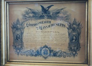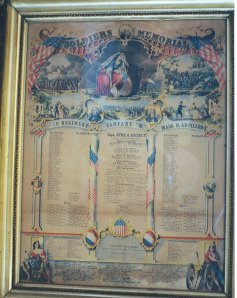 James was very proud of his service to America and was a member of the Grand Army of the Republic (G.A.R.) for many years and participated in many parades and ceremonies in Rochester, NH. He also prominently displayed his honorable discharge papers and this beautiful “Soldiers Memorial”.