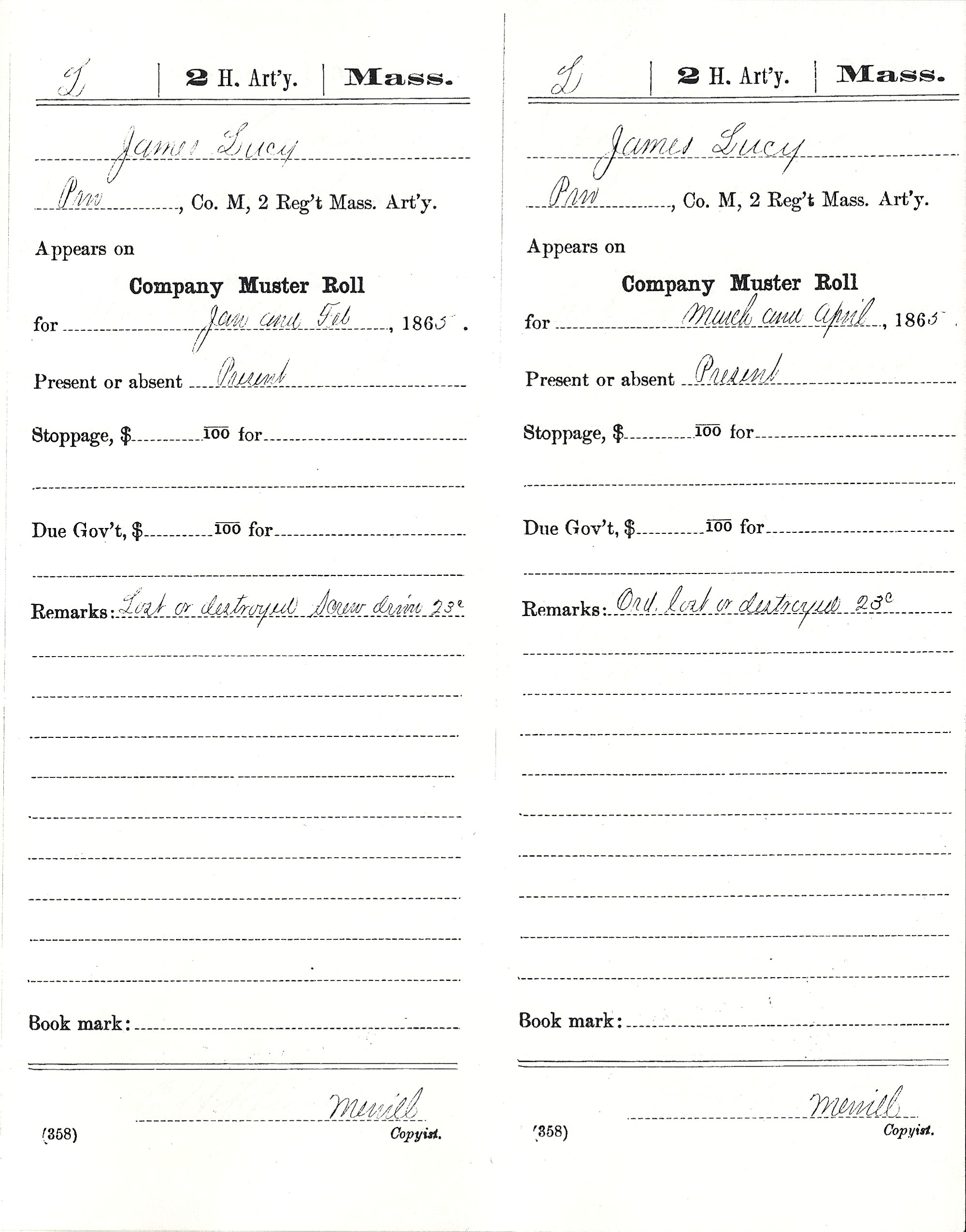 James enlisted 4 Dec 1863 for 3 years, at the time he was 16 years old (18 on the paperwork). He was the drummer boy for the Company M of the 2nd Massachusetts Heavy Artillery regiment. Company M was mustered into service on Christmas Eve, 1863. On 8 Jan 1864, under the command of Captain Jere A Greeley, they left for the regimental headquarters in Norfolk, Virginia.