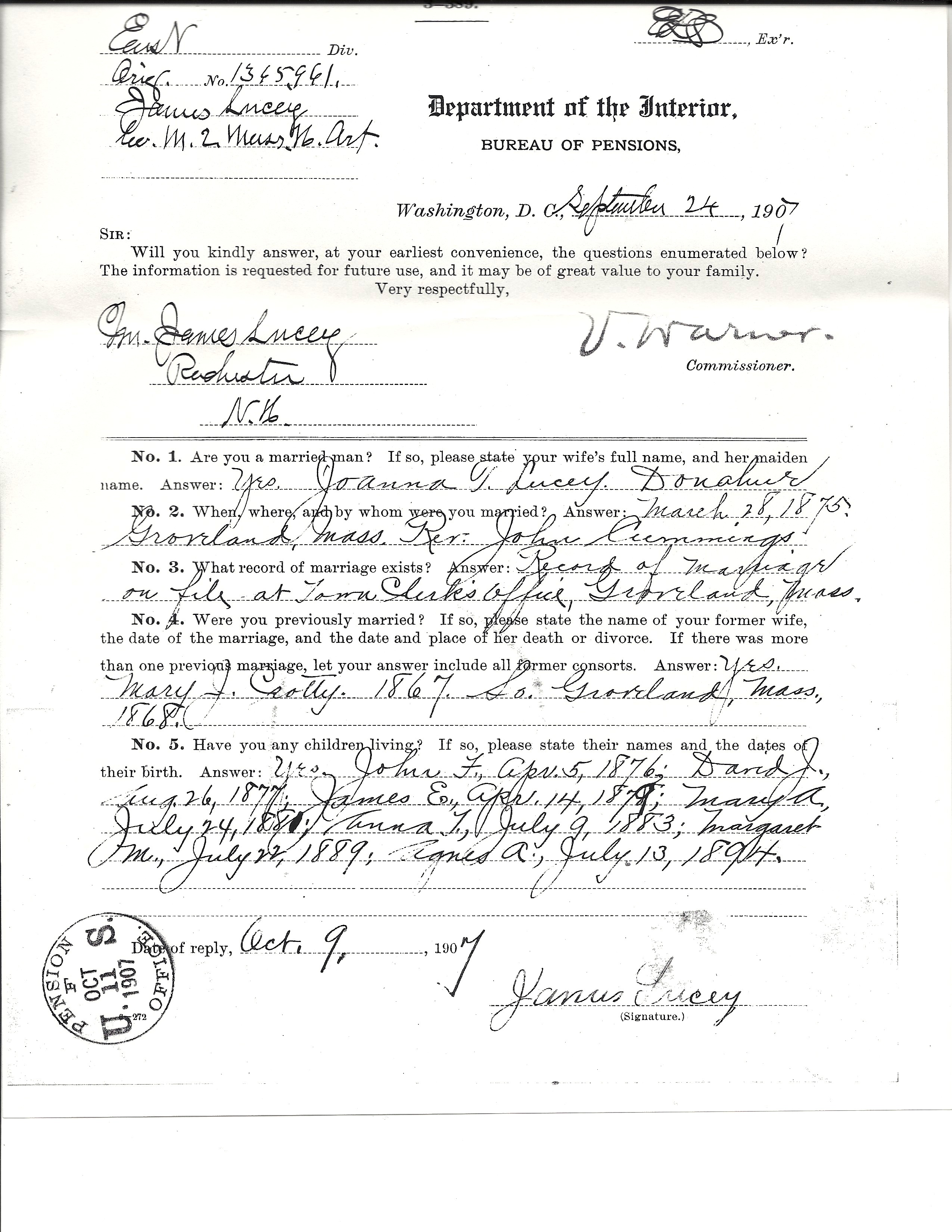 From James Pension applications, there is a wealth of information. This is how I learned about his first wife, Mary Crotty, who, along with son James, died in childbirth in 1868. James and his family lived next door to the Crotty’s in Groveland, MA in the 1865 census. Mary’s brother Edward Crotty remained good friends with James, as he moved to Rochester, NH around the same time and was godfather to James’ daughter Cecelia.