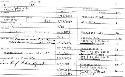 Martha was born about 1838 in New York, one of eight children born to John and Hester Sophia (Martine) Coles. At some point between 1840 and 1843, the family moved to Newark where Martha met Reuben Odell. They married 10 August 1856 in Newark and had eight children.