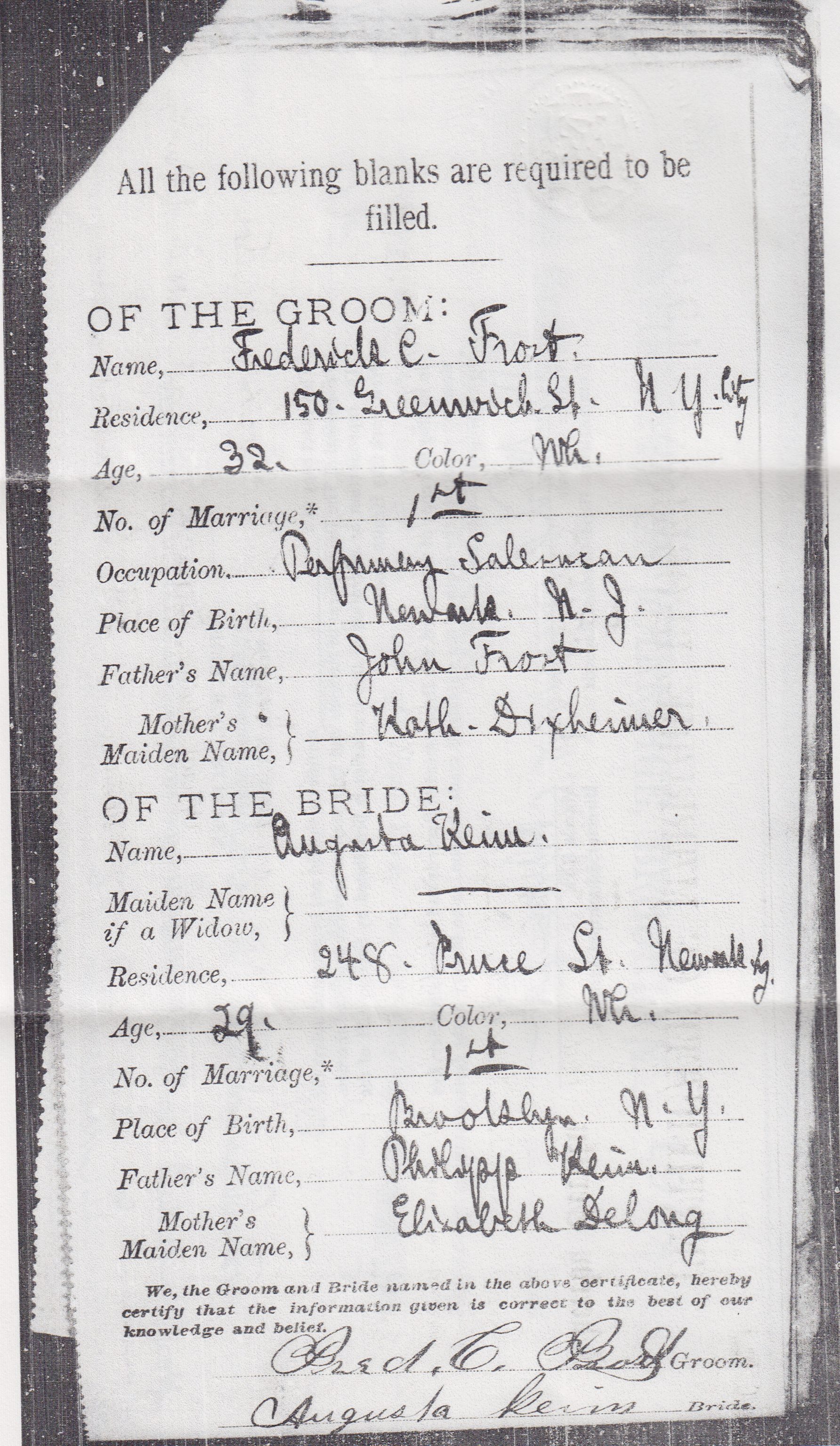 Staatsarchiv Hamburg. Hamburg Passenger Lists, 1850-1934 [database on-line]. Provo, UT, USA: Ancestry.com Operations Inc, 2008. Original data: Staatsarchiv Hamburg, Bestand: 373-7 I, VIII B 1 Band 078; Seite: 600 (Auswanderungsamt I). Mikrofilmrollen K 1701 – K 2008, S 17363 – S 17383, 13116 – 13183. Month : Indirekt Band 078 (1 Apr 1889 – 29 Jun 1889)The Marriage Certificate