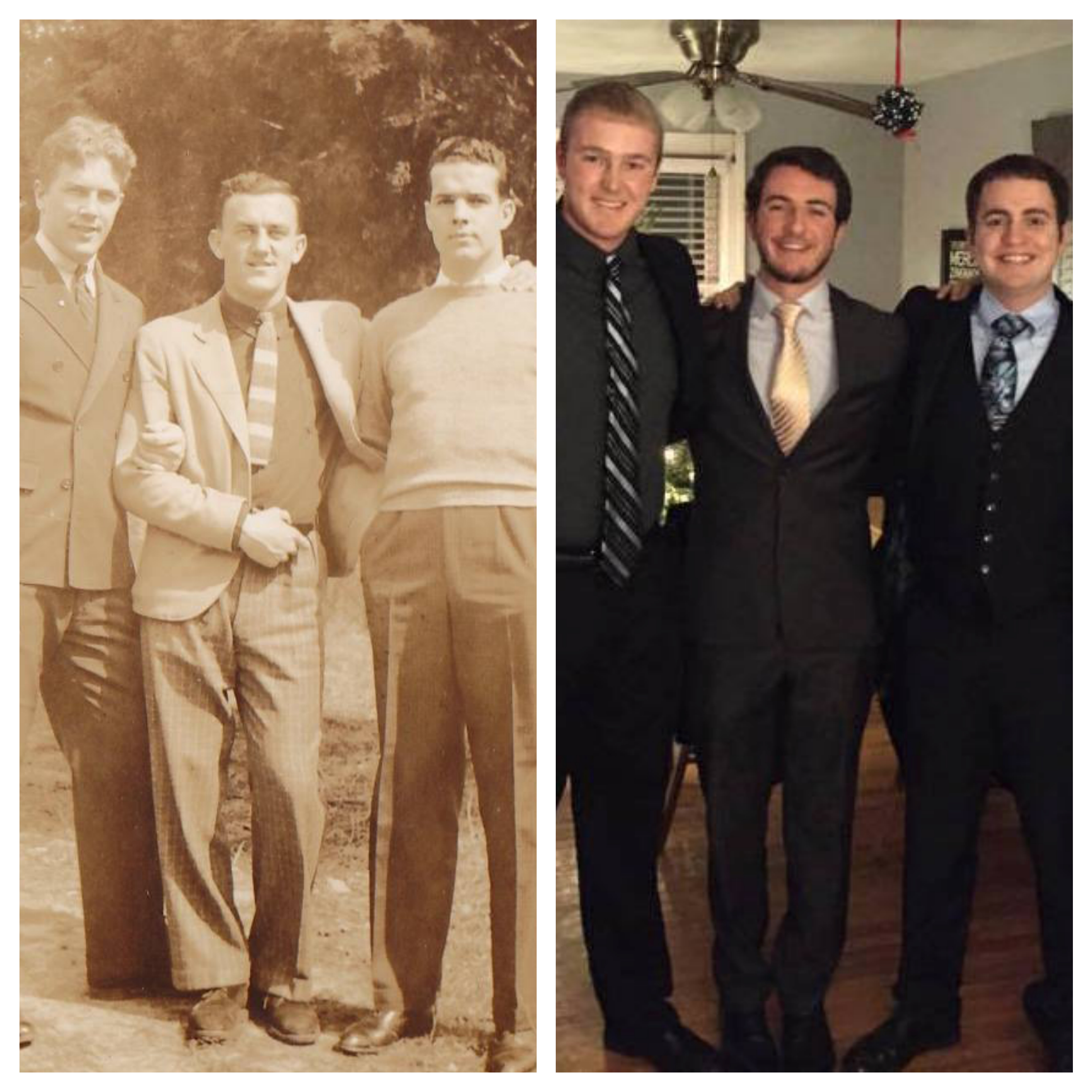 Well-dressed David J Lucey, 1936 and John Lucey, 2014, flanked by friends at NC State.